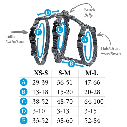 | XS-S: | 29 - 39 cm | 38 - 52 cm | 33 - 52 cm | 1,5 cm |
